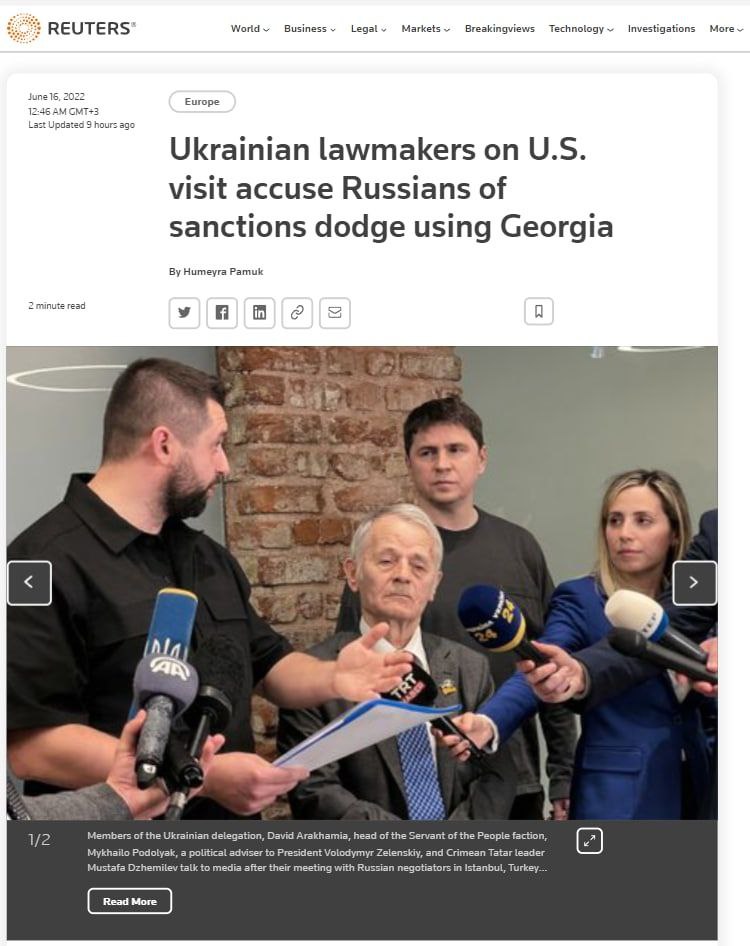 10:08 Грузия помогает компаниям из РФ обходить западные санкции, сообщили украинские депутаты во время визита в США, пишет Reuters.