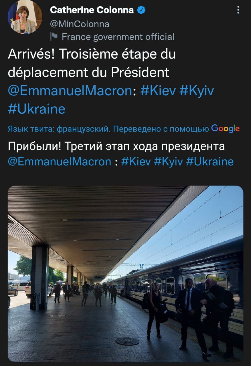 10:09 Глава МИД Франции Катрин Колонна заявила о прибытии поезда с Макроном, Шольцем и Драги на киевский вокзал.