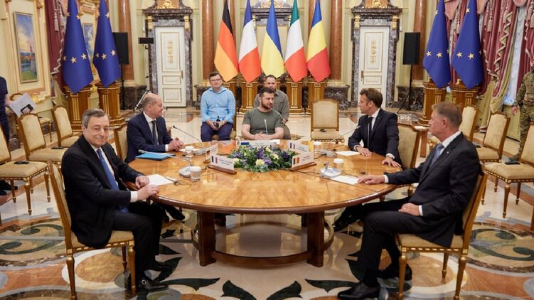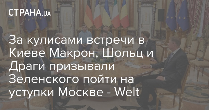 Президент Франции Эммануэль Макрон, канцлер ФРГ Олаф Шольц и премьер-министр Италии Марио Драги за кулисами встречи с украинским президентом Владимиром Зеленским призывали Украину пойти на уступки Москве. Тройка европейских лидеров хочет "максимально-рентабельного мирного решения".
