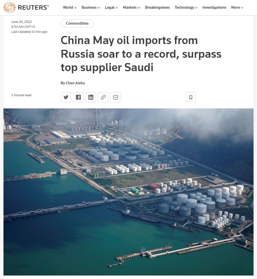 Китай вслед за Индией рекордно нарастил импорт российской нефти. В прошлом месяце импорт сырой нефти из РФ вырос на 55% по сравнению с маем 2021-го.