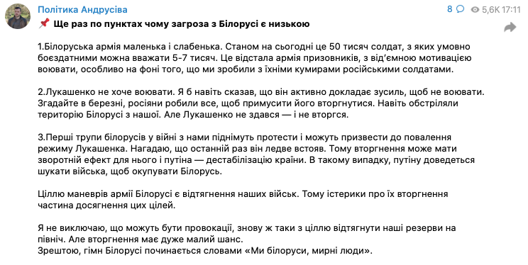 Советник главы МВД Виктор Андрусив уверен, что Беларусь не нападет на Украину, потому что армия РБ "маленькая и слабенькая", а первые потери могут привести к протестам и падению режима Александра Лукашенко.