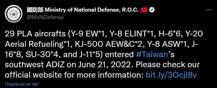 "29 самолетов НОАК типа Y-9 EW1, Y-8 ELINT1, H-66, Y-20 для дозаправки в воздухе 1, KJ-500 AEW&C2, Y-8 ASW1, J-168, SU-304 и J-115 вошли в юго-западную зону действия ПВО Тайваня 21 июня 2022", - говорится в заявлении Министерства национальной обороны острова.