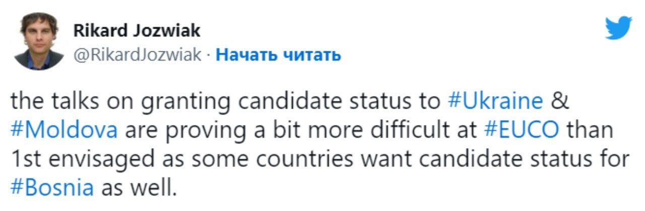 20.43 Стартовавшие час назад переговоры стран ЕС о статусе кандидата для Украины уже столкнулись с осложнениями.
