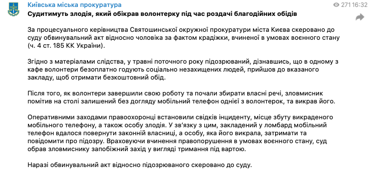 В Киеве мужчина украл мобильный телефон у волонтера, которая его накормила