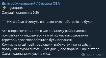 В Сумской области машина полицейских подорвалась на мине, есть раненые и погибший. Об этом сообщил глава Сумской областной военной администрации Дмитрий Живицкий в Telegram.