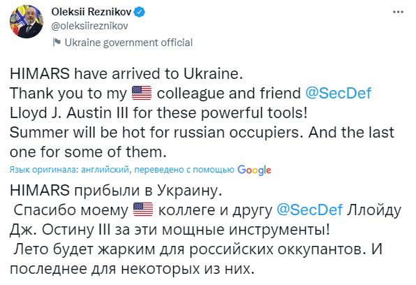 "HIMARS прибыли в Украину. Спасибо моему коллеге и другу Ллойду Дж. Остину III за эти мощные инструменты! Лето будет жарким для российских оккупантов. И последнее для некоторых из них", - говорится в сообщении.