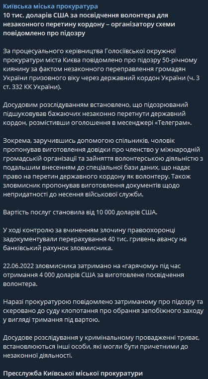 Он подыскивал кандидатов на выезд через Telegram и за 10 тысяч долларов предлагал оформление справки о членстве в волонтерской организации, которая позволяла выехать из страны, сообщили в прокуратуре.