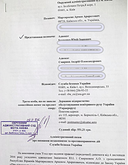Адвокат Мартиросяна Юрий Иващенко продемонстрировал иск в Окружной административный суд Киева. "Суть иска - незаконный возврат воздушного судна, незаконное снятие пассажира с борта самолета, противоправный досмотр по процедуре таможенного досмотра. Фактически произошло задержание иностранного гражданина", - пояснил адвокат.