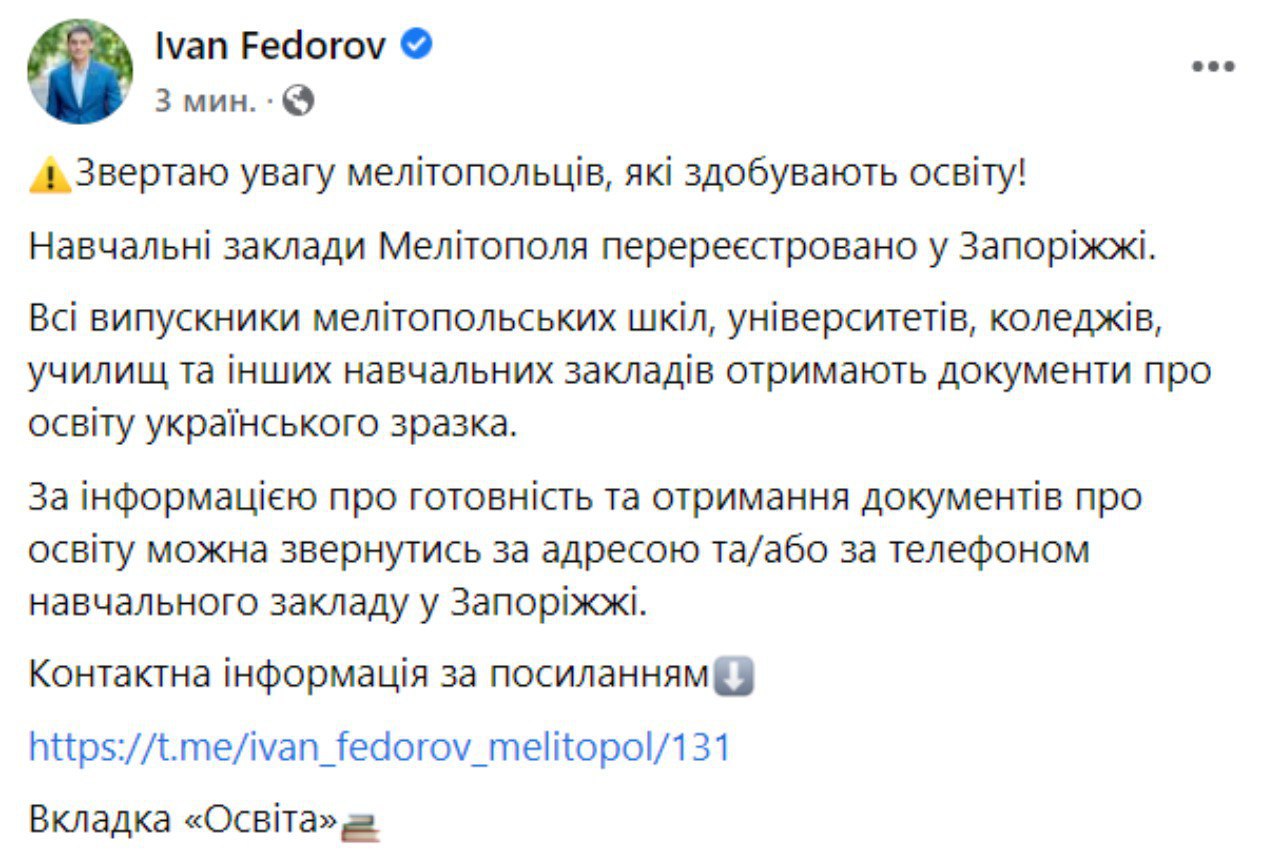 "Все выпускники мелитопольских школ, университетов, колледжей, училищ и других учебных заведений получат документы по образованию украинского образца", – сообщает мэр.