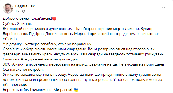 По его словам, Славянск обстреляли кассетными снарядами.