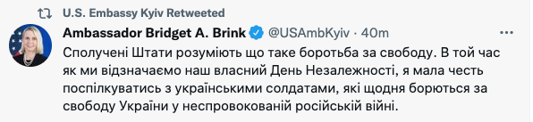 "Соединенные Штаты понимают, что такое борьба за свободу. В то время как мы отмечаем наш собственный День Независимости, у меня была честь пообщаться с украинскими солдатами, которые ежедневно борются за свободу Украины в неспровоцированной российской войне", - написала посол.