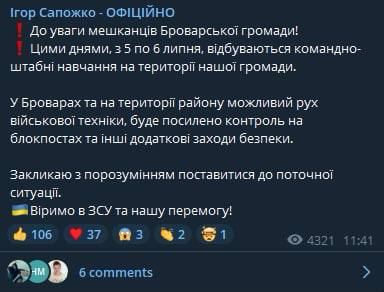 Он предупредил, что в связи с учениями в Броварах и на территории района может передвигаться техника, быть усилен контроль на блокпостах и введены меры дополнительной безопасности.