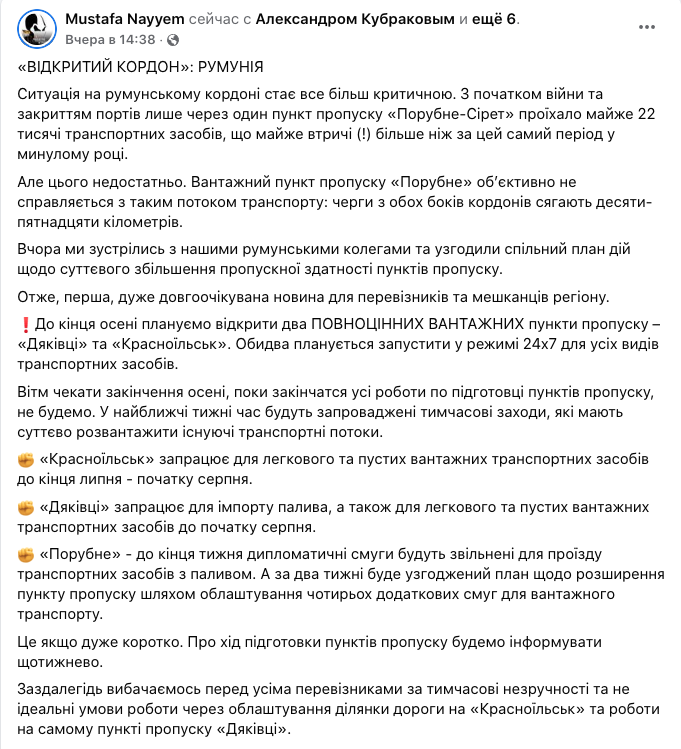 "Оба пункта пропуска планируется запустить в режиме 24/7 для всех видов транспортных средств. Впрочем, ждать окончания осени, пока закончатся все работы по подготовке пунктов пропуска, не будем. В ближайшие недели будут введены временные меры, которые должны разгрузить существующие транспортные потоки", - написал Найем.