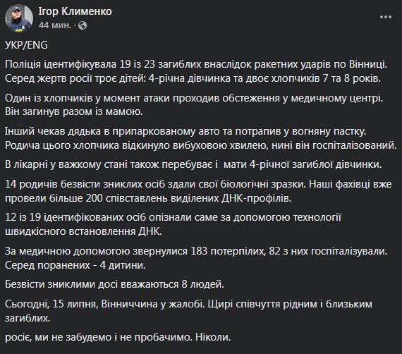 2. "Глава МВД доложил мне о ситуации в Виннице. За помощью обратилось почти 200 человек, пропавших без вести на данный момент четверо. По погибшим цифры не изменились - 23".
