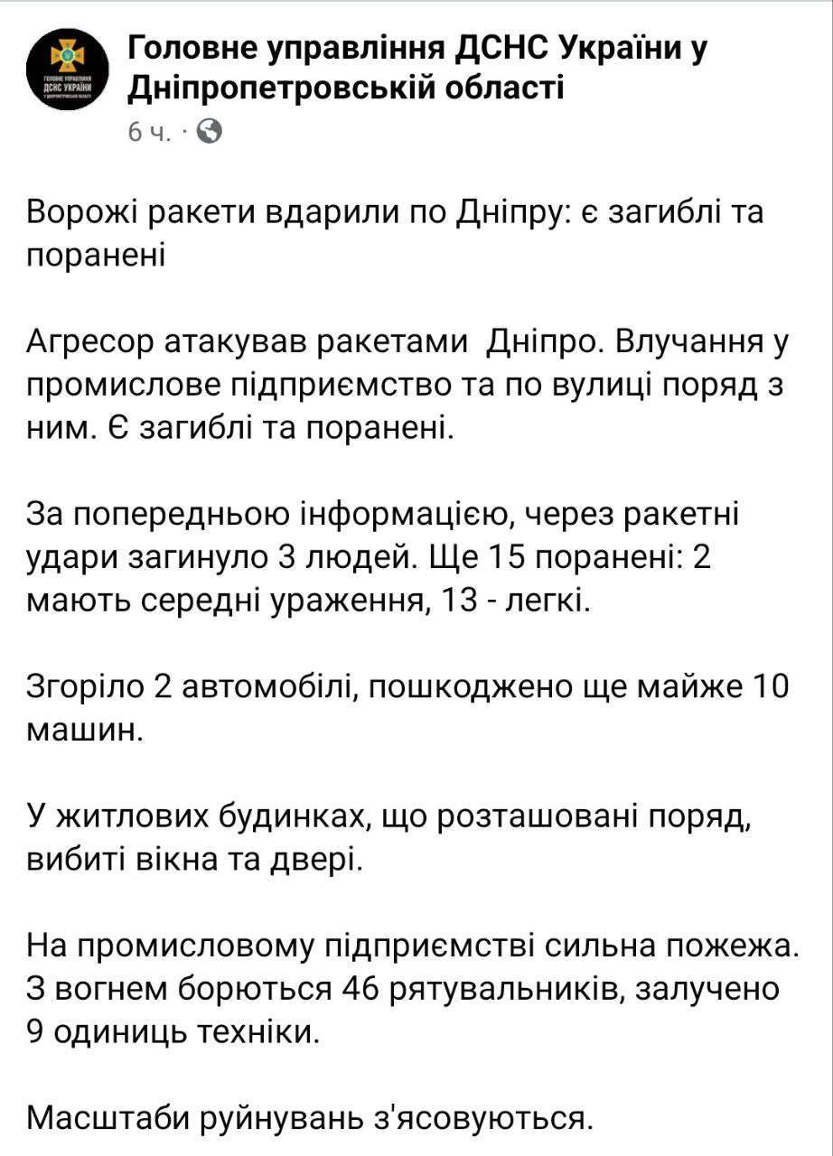 06.39 Информация от ГосЧС по вчерашней ракетной атаке в Днепре: