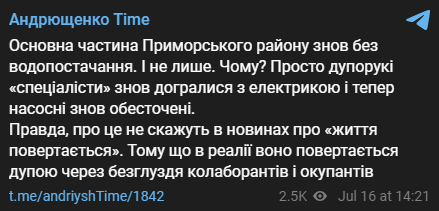 "Почему? Просто "специалисты" снова доигрались с электричеством и теперь насосные снова обесточены. Правда, об этом не скажут в новостях про "жизнь возвращается", - сказал он.