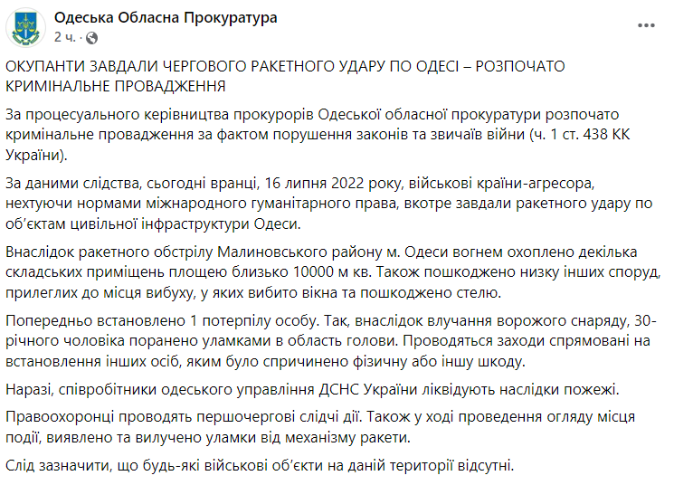 Прокуратура Одессы сообщает, что в результате утреннего ракетного удара по Одессе пострадал один человек - 30-летний мужчина ранен в голову обломками.
