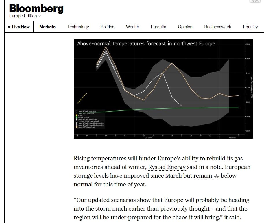 Европа не сможет запастись газом к зиме из-за анормальной жары - Bloomberg
