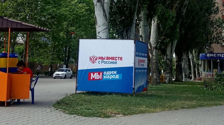 В городе появились стенды с лозунгом "Мы один народ с Россией" и наружная реклама такого же содержания.