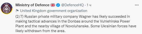 "Российская ЧВК "Вагнера" преуспела в тактическом наступлении на Донбассе в районе Углегорской ТЭС и близлежащего поселка Новолуганское. Некоторые украинские силы, вероятно, уже выведены из этого района", - говорится в сообщении.