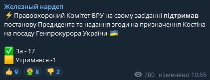 Правоохранительный Комитет Рады поддержал предложение президента Владимира Зеленского назначить нардепа Андрея Костина генеральным прокурором. Об этом сообщил народный депутат Ярослав Железняк у себя в Telegram.
