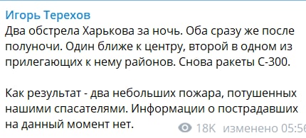 После полуночи ударили по центру и окраине Харькова. Возникло два пожара, о пострадавших не сообщается, информировал мэр Игорь Терехов.