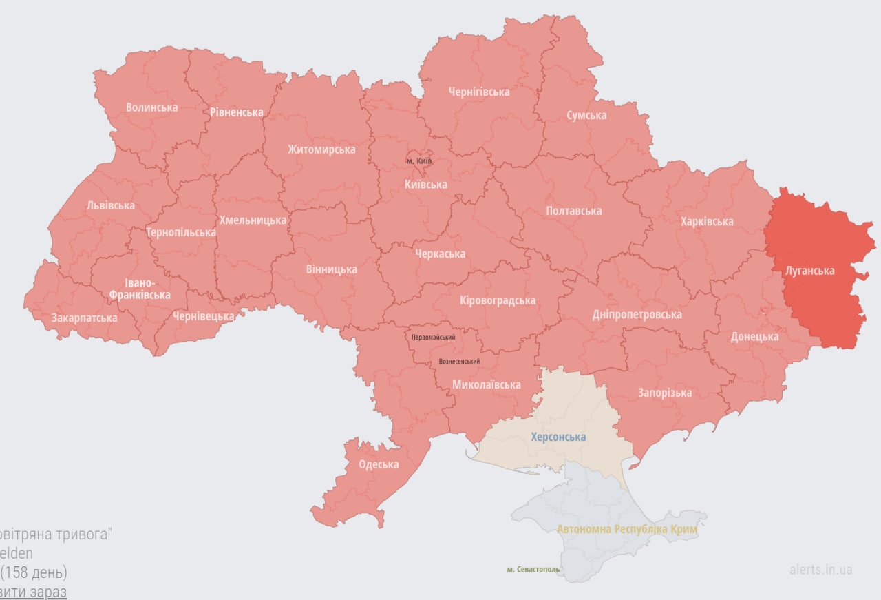 22.51 Воздушная тревога уже по всей территории Украины (кроме Херсона и Крыма).