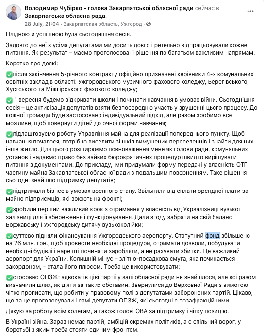 Об этом заявил глава Закарпатского облсовета Владимир Чубирко.