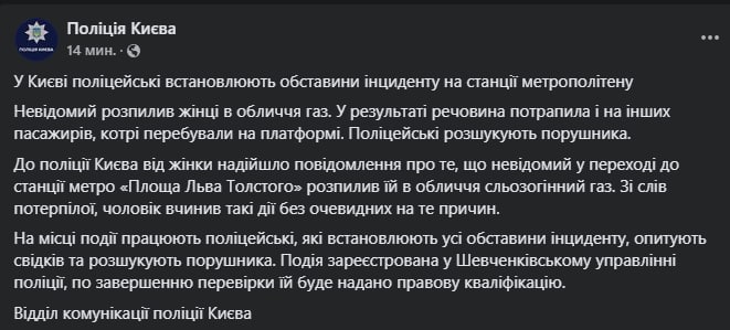 Как сообщили в полиции, в переходе к станции "Площадь Льва Толстого", что неизвестный мужчина без очевидных причин распылил женщине в лицо газовый баллончик.