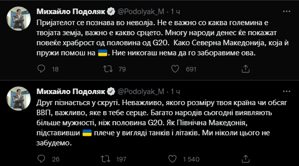 "Много народов сегодня проявляют больше мужества, чем половина G20. Как Северная Македония, подставив плечо Украине в виде танков и самолетов. Мы никогда этого не забудем", - написал Подоляк в Твиттере.