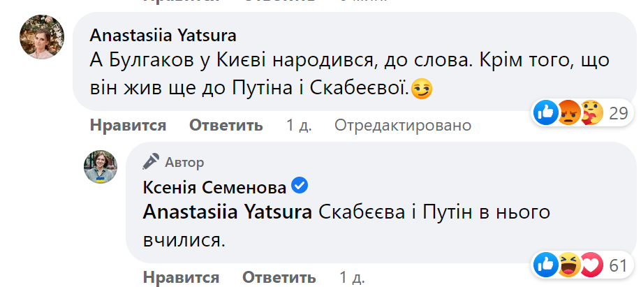 Автору поста - депутату Семеновой - напомнили, что Булгаков родился в Киеве и задолго до Путина и Скабеевой. Депутат ответила, что они "у него учились".