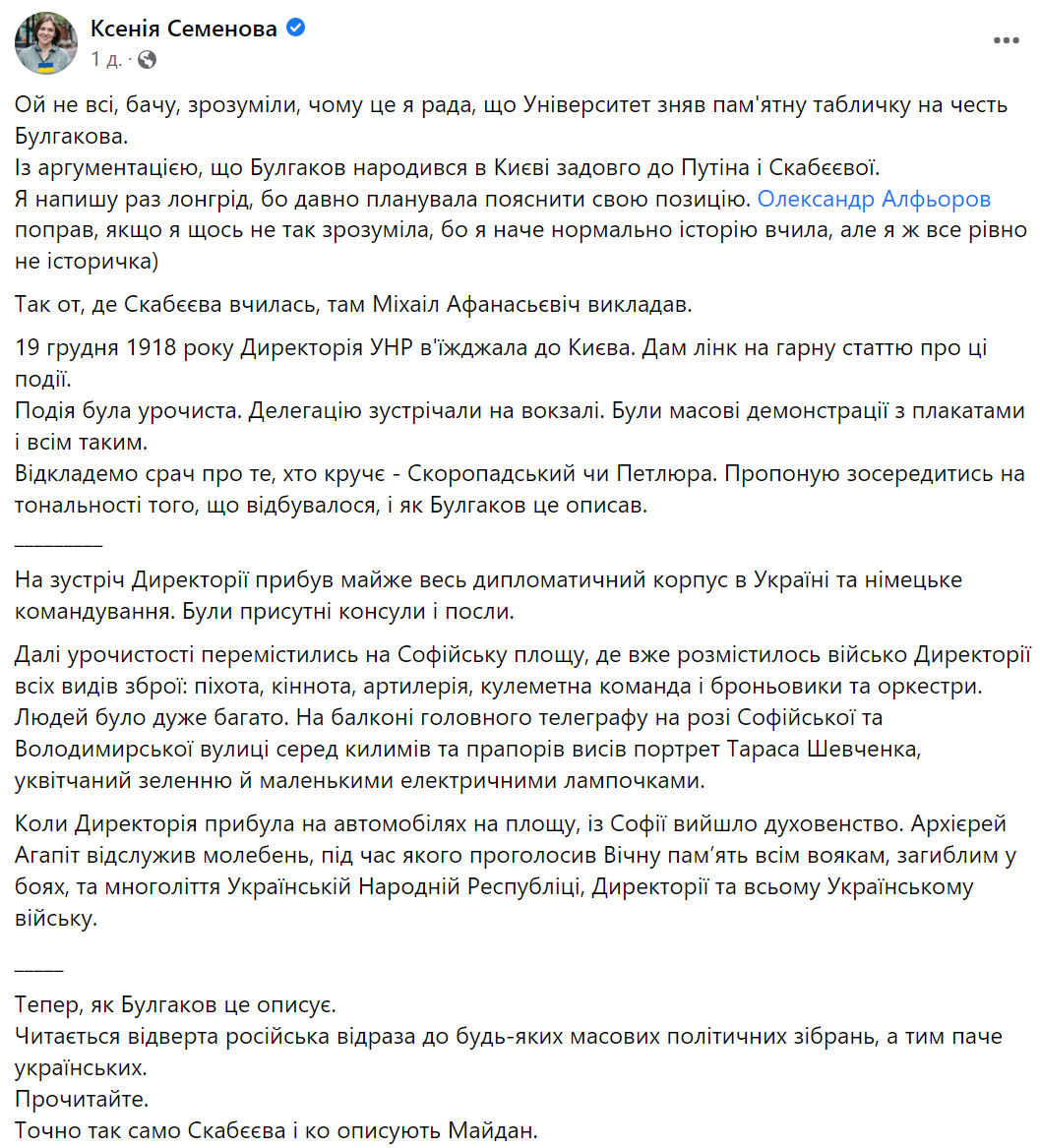 Бурная дискуссия развернулась в комментариях к посту депутата Киевсовета Ксении Семеновой, которая ранее призывала снести памятник Булгакову на Андреевском спуске. А теперь поддержала демонтаж доски со здания КНУ.