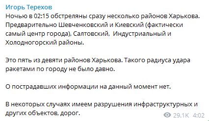 "Это пять из девяти районов Харькова. Такого радиуса удара ракетами по городу не было давно", - сообщил мэр Игорь Терехов.