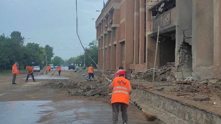 Коммунальщики убирают последствия обстрела. Фото: Александр Сенкевич в Telegram