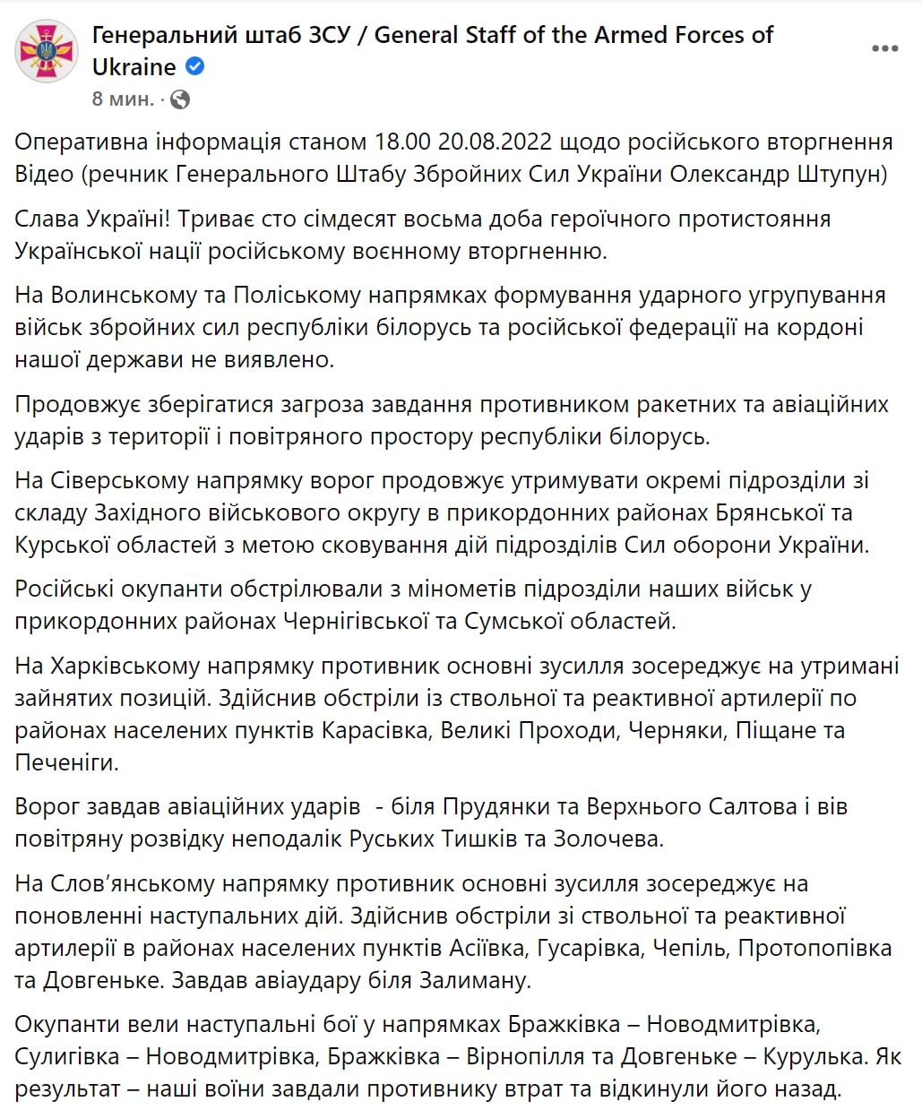 В субботу, 20 августа, идет уже 178-й день войны с Россией.