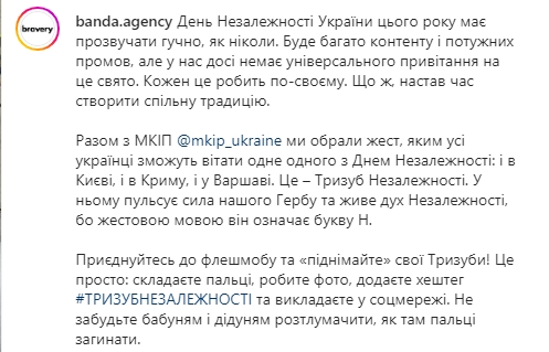 В Banda Agency призывают украинцев присоединяться к флешмобу и делать фото с этим жестом, после чего выкладывать их в соцсети с хештегом #тризубнезависимости.