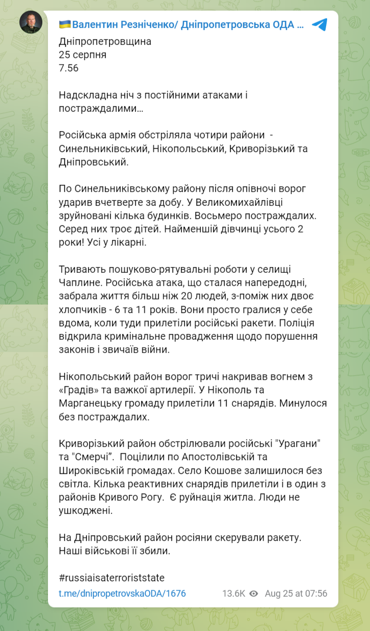 В ночь на четверг, 25 августа, российская армия обстреляла четыре района Днепропетровской области. Среди них - Днепровский, Никопольский, Синельниковский и Криворожский.