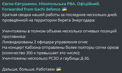 Советник главы Никопольской РВА сообщил, что в результате обстрелов за последние несколько дней в Энергодаре были уничтожены два российских офицера, более полторы сотни российских военных и еще больше раненных, несколько РСЗО и гаубицы Д-30.