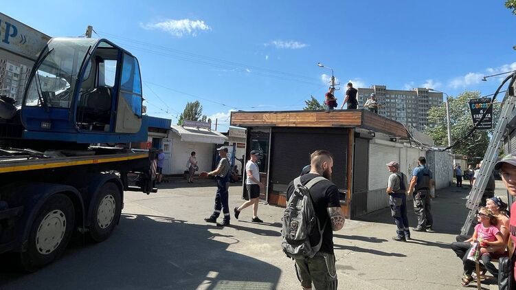 В Киеве сносят десятки МАФов возле метро "Героев Днепра". Люди залезли на крыши и протестуют. Видео