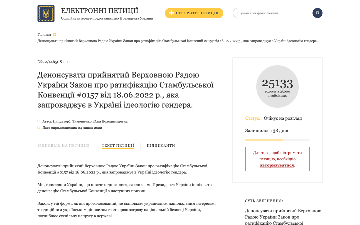 Петиция, созданная Юлией Тимошенко и призывающая денонсировать принятый недавно Верховной Радой закон о ратификации Стамбульской конвенции, набрала 25 тысяч голосов. Теперь ее должен рассмотреть президент Украины.