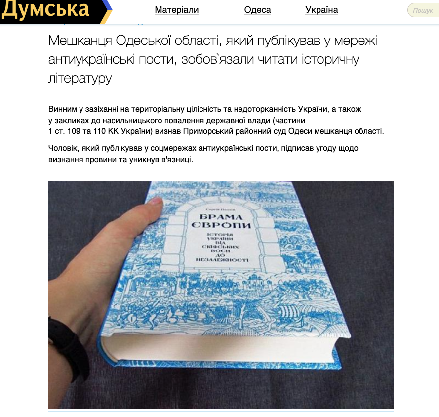 При этом нарушителя обязали прочитать произведения Сергея Плохия "Врата Европы. История Украины от скифских войн до независимости" и Романа Иванычука "Орда".