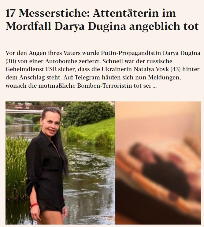 16:10 Австрийское издание Exxpress распространило информацию о якобы гибели в Австрии Натальи Вовк, которую Россия обвиняет в убийстве Дарьи Дугиной.