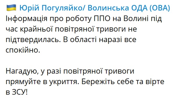 21:15 На Волыни не подтвердилась работа ПВО, сообщил губернатор Юрий Погуляйко. Ранее там сообщалось о взрывах.