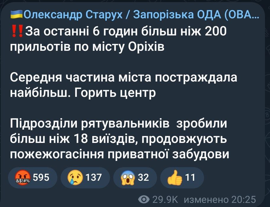 21:35 По городу Орехову Запорожской области за последние шесть часов было более 200 прилетов, сообщил губернатор Александр Старух.