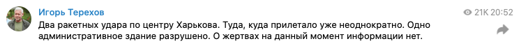 20:56 Мэр Харькова Игорь Терехов подтверждает удары по центру Харькова около административного здания «куда уже прилетало неоднократно».