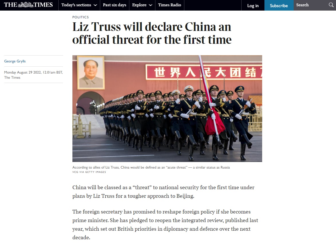 11:38 Глава МИД Великобритании Лиз Трасс намерена впервые объявить Китай "угрозой" для нацбезопасности страны, если станет премьер-министром.