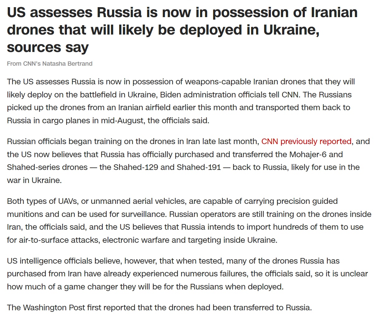 Представители американской разведки считают, однако, что при испытаниях многие иранские беспилотники, которые Россия закупила, уже начали ломаться, поэтому неясно, насколько они изменят правила игры в Украине.