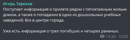 10:39 Мэр Харькова Игорь Терехов сообщает о прилете рядом с пятиэтажным жилым домом, а также о попадании в одно из дошкольных учебных заведений в центре города.