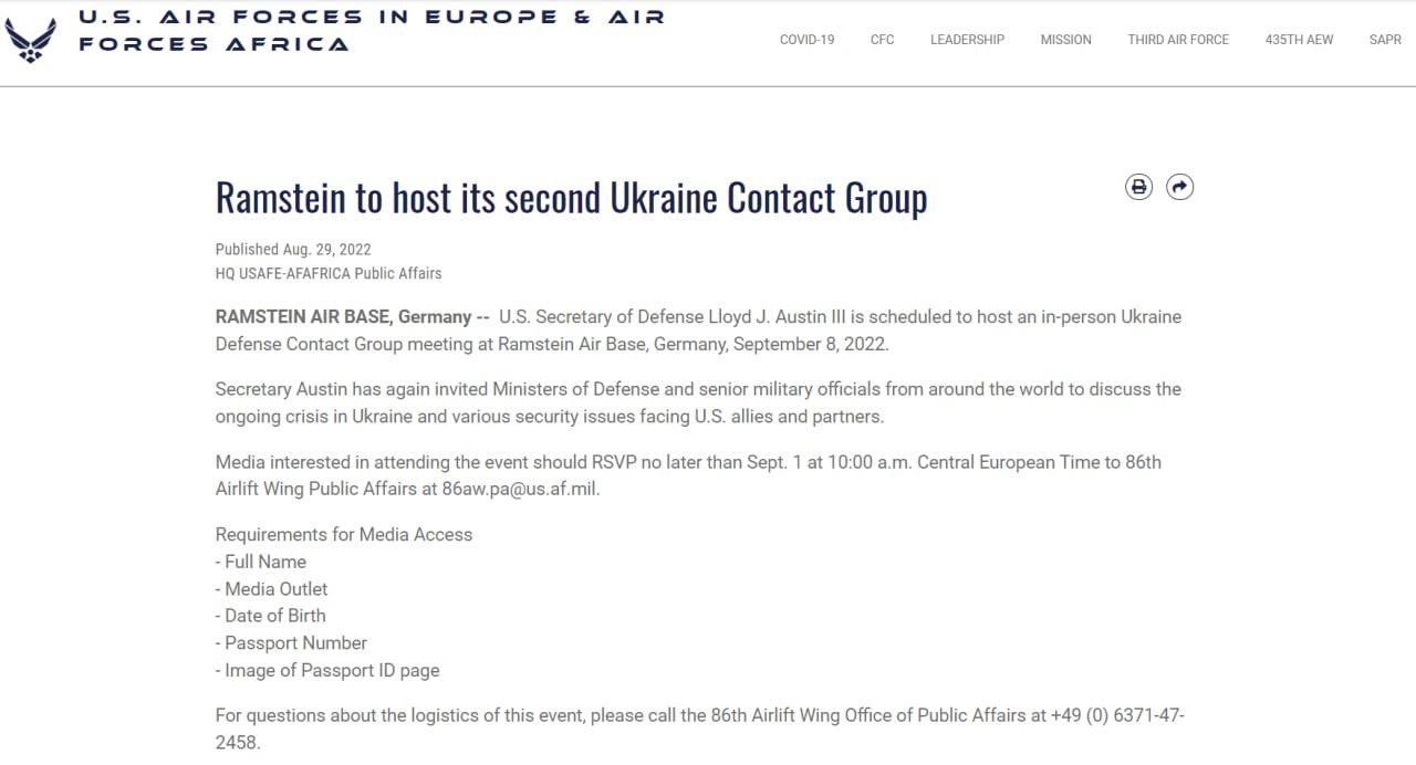 Очередная встреча контактной группы по Украине в формате Рамштайн состоится 8 сентября 2022 года.