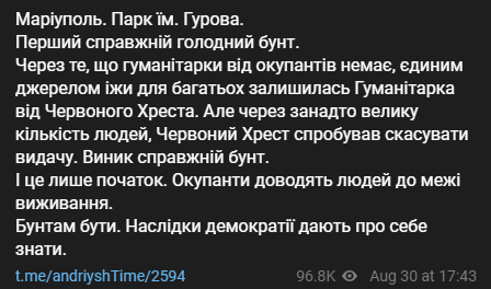 Он сообщил, что инцидент произошел в парке Гурова. По его словам, Красный Крест пытался раздать гуманитарную помощь и это практически единственная возможность получить еду в городе. Сами российские оккупанты не занимаются поставкой гуманитарки.